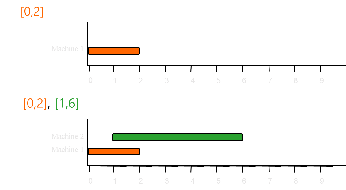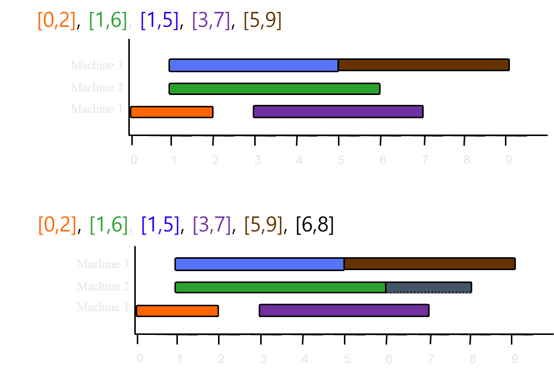 작업 스케줄링 문제는 작업의 수행 시간이 중복되지 않도록 모든 작업을 가장 적은 기계의 수에 배정하는 문제이다.